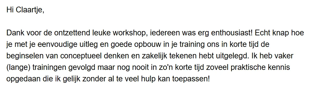 Vraag vandaag nog een workshop zakelijk tekenen voor jouw team via onderstaand formulier. Dan kijken we samen hoe deze workshop de meeste waarde oplevert voor jouw team.