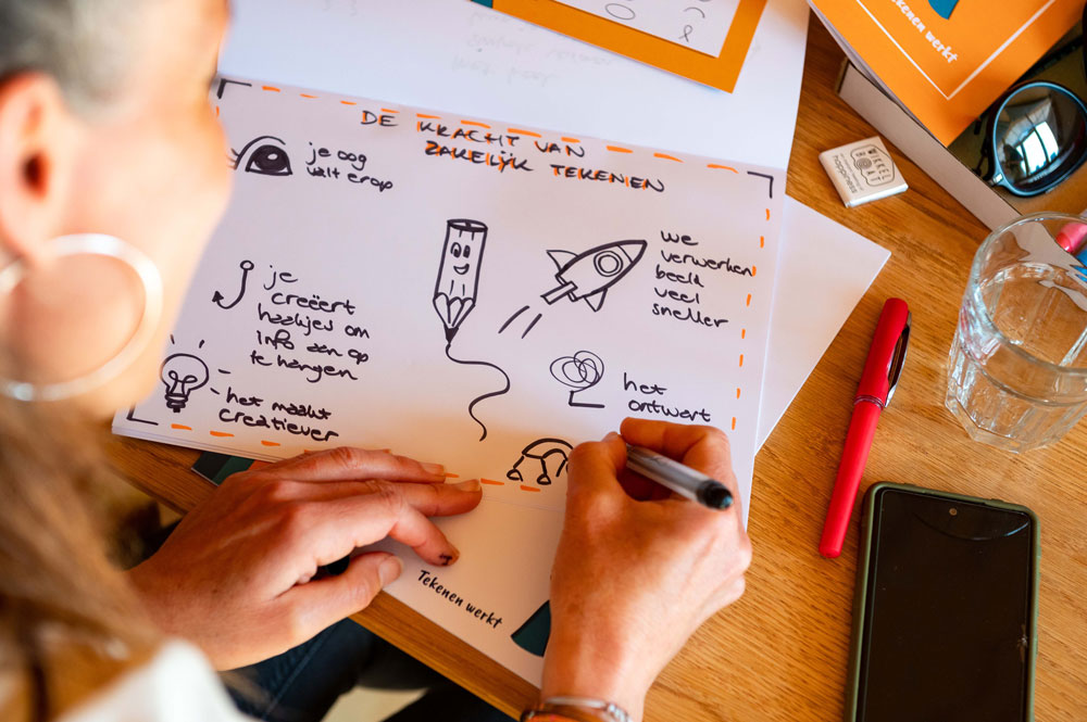 Inspiratie én de vaardigheden om zakelijk tekenen direct in te zetten, bijvoorbeeld voorafgaand aan, tijdens en na afloop van overleggen, in presentaties en verslagen, en andere communicatie.